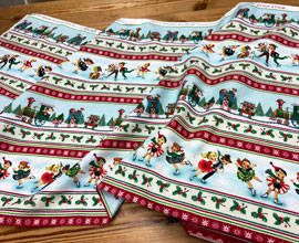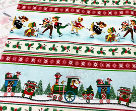 USAコットン マイケルミラーのクリスマスプリント。スケートを楽しむ子供たちと、汽車に乗ってプレゼントを運ぶサンタクロースとトナカイのボーダー柄。お菓子を入れるクリスマスバッグやホームパーティーエプロンなど小物作りに。