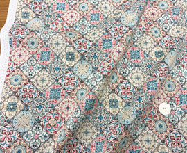 1マスずつ繊細な幾何学模様、万華鏡のようなプリント。配色は生成り、ベージュ、赤、ピンク、ターコイズ濃淡、こげ茶