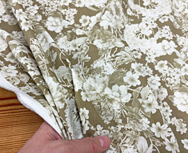 地色は黄みがかった茶、柄は生成り、薄茶、写実的な草花プリント。