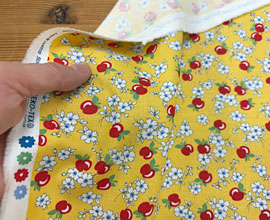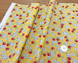 USAのmodaのコットンでヴィンテージを思わせるフルーツと花プリント。レモン、洋ナシ、りんごなど。ブラウス、スカート、ワンピース、バッグなどの小物やパッチワークなどに。