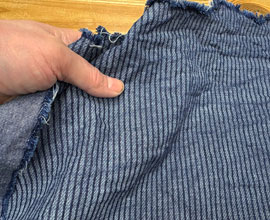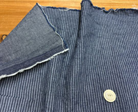 平織りコットンと綾織りコットンの2重織りで、インディゴ染め。厚みと強度があり秋冬に着られるコットンです。水通ししてアイロンをかけないで撮影しています。水を変えて数回もみ洗いしました。