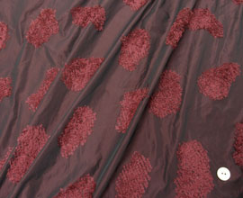 タテ糸が黒、ヨコ糸がボルドーのシャンブレーのポリエステルのメモリー加工。フサフサした歪な水玉が織り込まれています。
