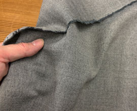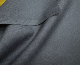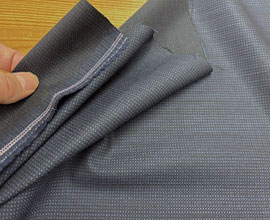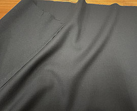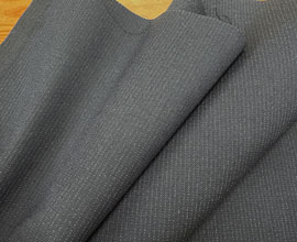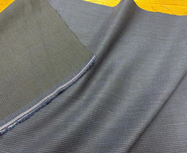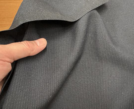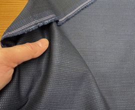 ウールとポリエステルでしっかり織られた濃紺のピンストライプ。ラインは点々と薄く見える程度で無地感覚です。ウール扱いだとA〜Bですが